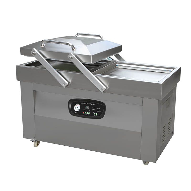 The double chamber vacuum packing machine is a typical type of chamber vacuum sealer, designed for the small and medium-size production capacity of vacuum sealing. Compared to single chamber vacuum sealer, a double chamber vacuum packing machine owns 2 working chambers and 1 swingable chamber cover.
