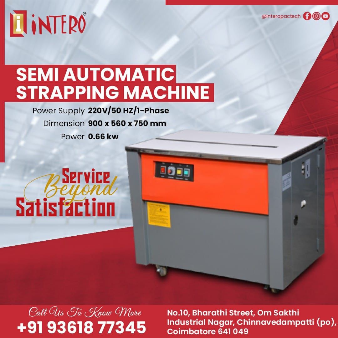 Semi Automatic Strapping Machines are packaging machines that use bands of flat steel or plastic tightened around a package or pallet of goods and fasten together to secure the package. Straps can bundle products together, improve containment strength and to secure a load to a shipping pallet. Straps are made from a variety of materials based on the required strength of the strap.