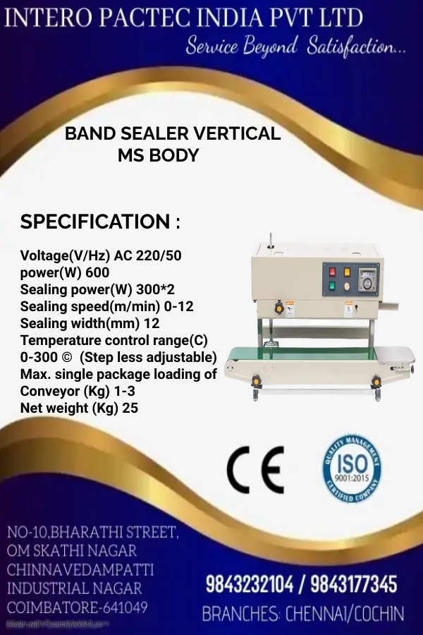 The band sealer is an automated form of a heat sealer with a conveyor belt. Driven by a motor controlled by a speed regulator, bags of unpacked material are filled into a Teflon heating element which seals the ends of each bag via thermoplastic melting. This conveyor belt can be height adjusted based on different product needs