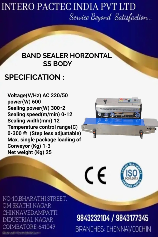 Continuous band sealer can seal plastic films made from various materials continuously. There are two models, including horizontal model. Constant temperature control and temperature is adjustable. Stepless speed regulation band sealer is suitable for sealing small package in foodstuffs, general merchandise, medicine, spices , seeds and chemical industries.